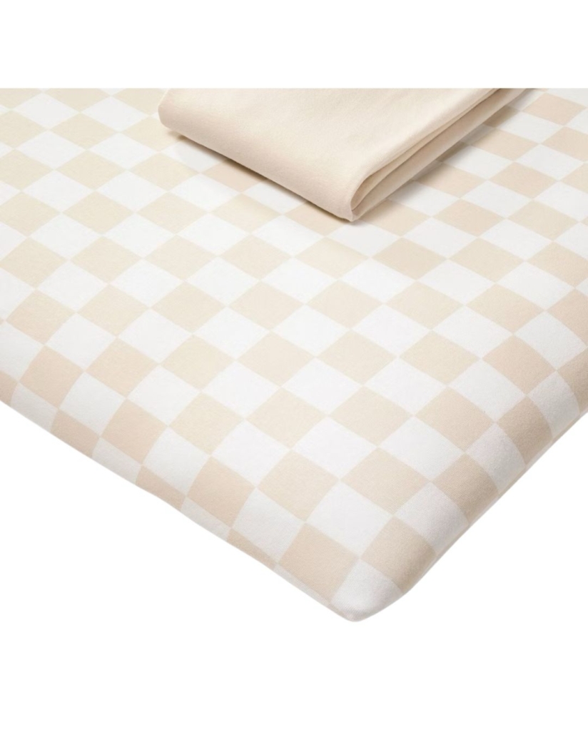 Includes (1) solid peach and (1) gingham-print play yard sheets