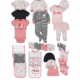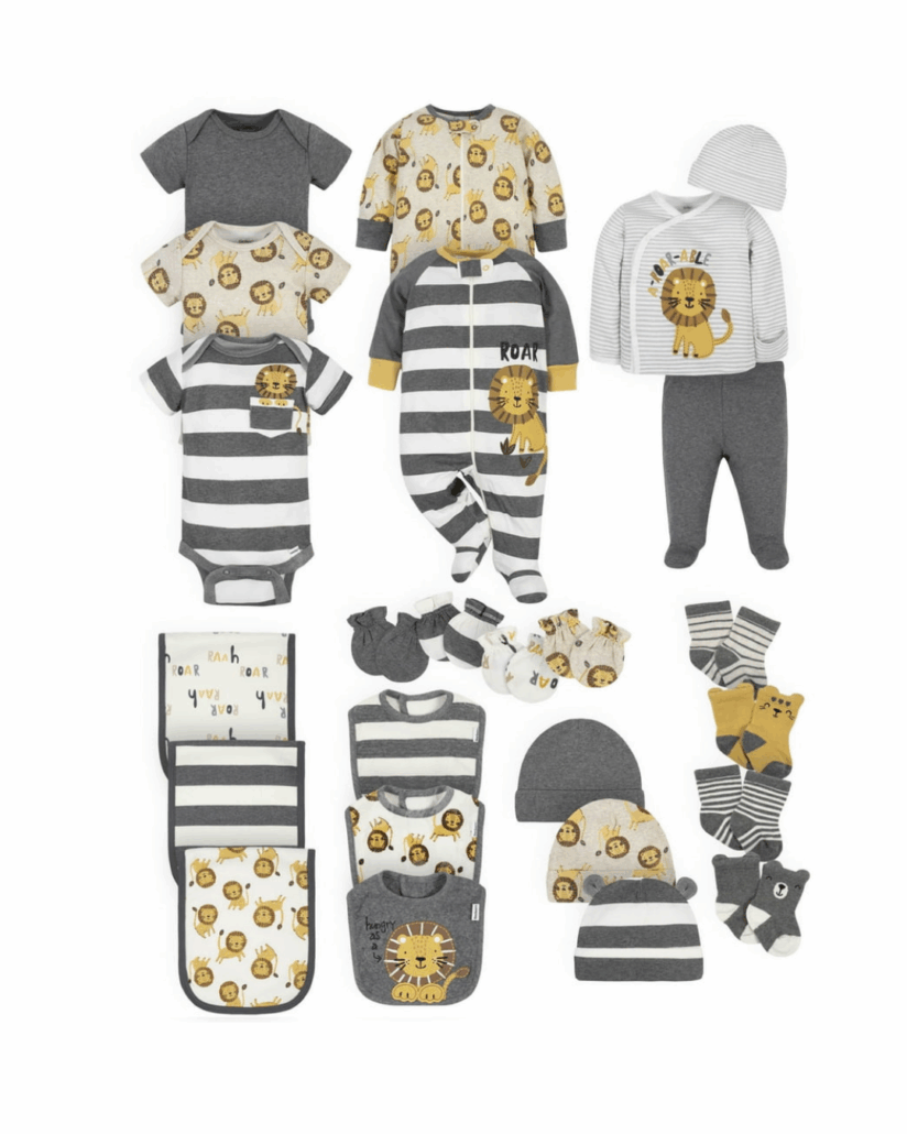 - Includes: (3) Onesies, (2) Sleepers, (3) Piece Outfit, (3) burp cloths, (3) bibs, (3) hats, (4) socks, (4) pairs of mittens